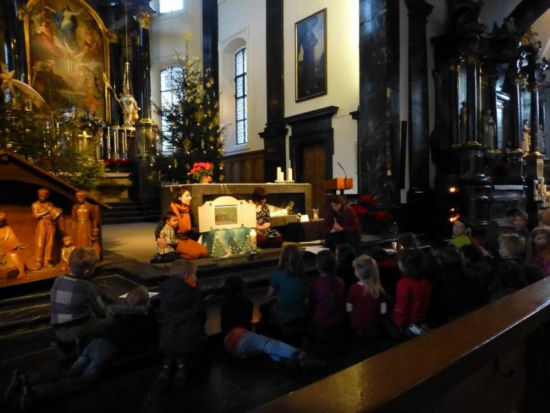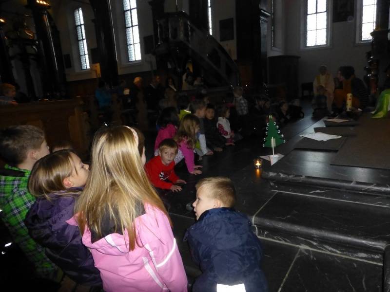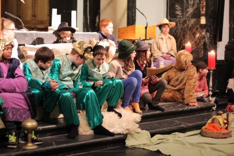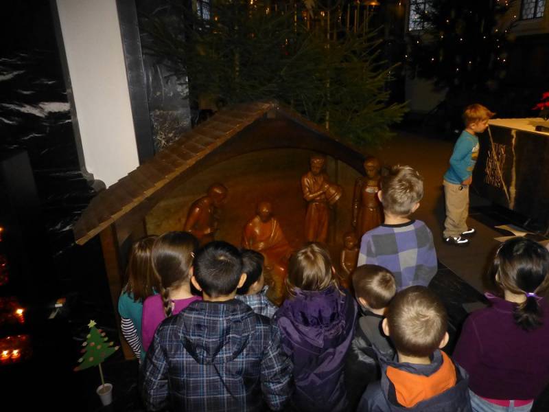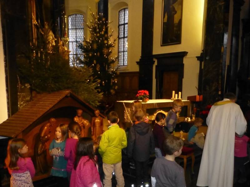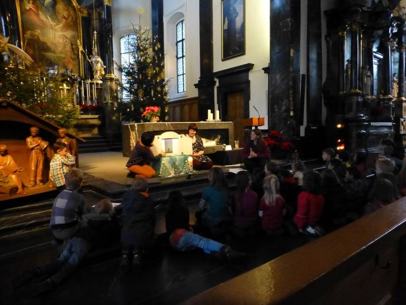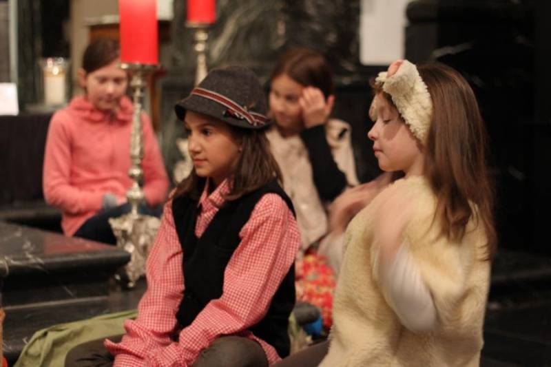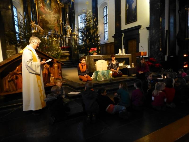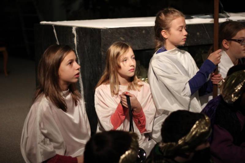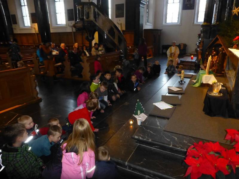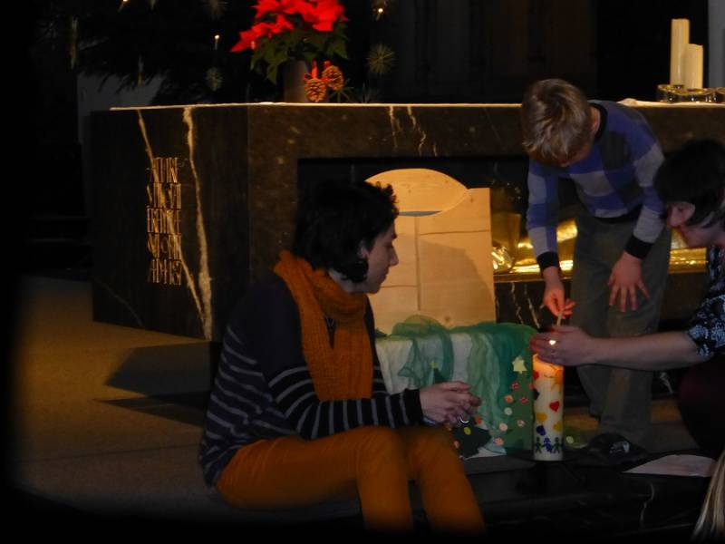 Kinder versammelten sich vorne im Chor und schmücken den Weg, den Maria und Josef nach Bethlehem angetreten haben.
