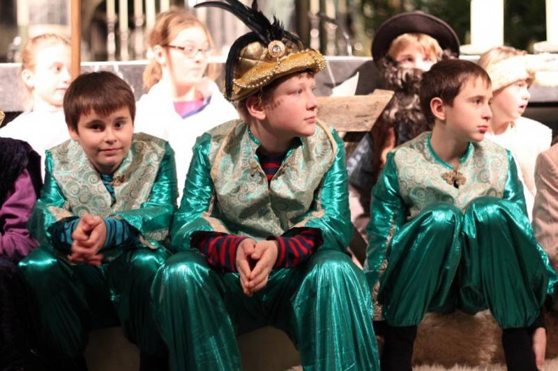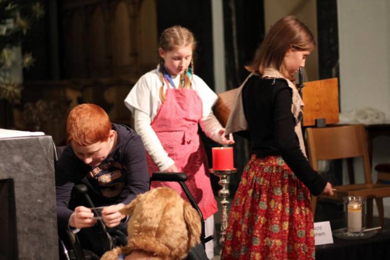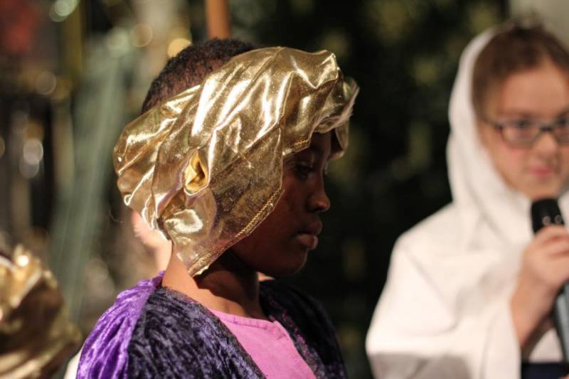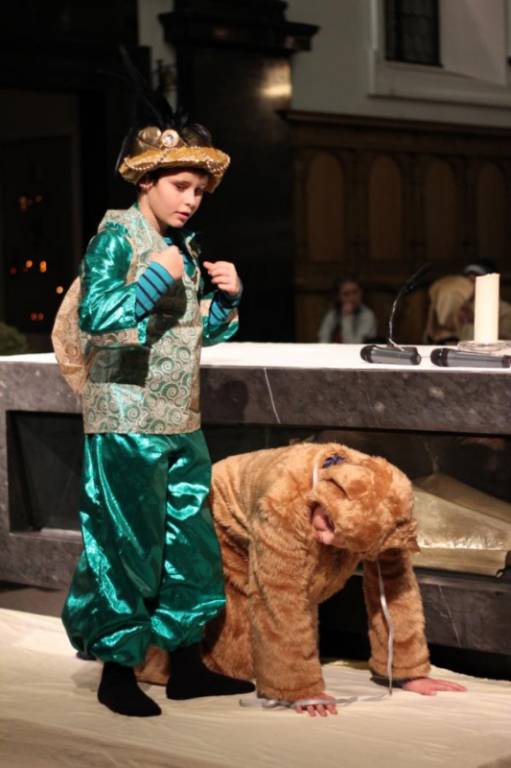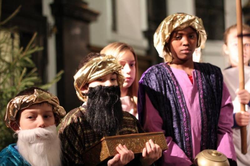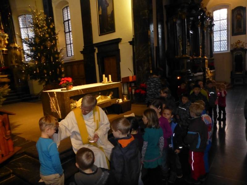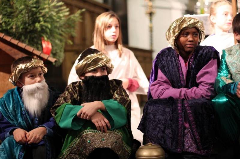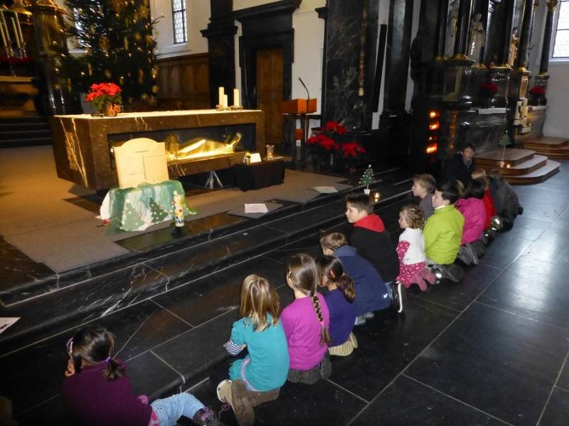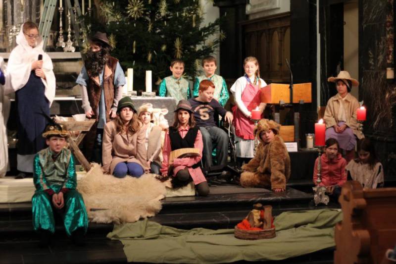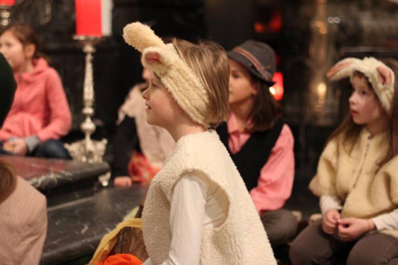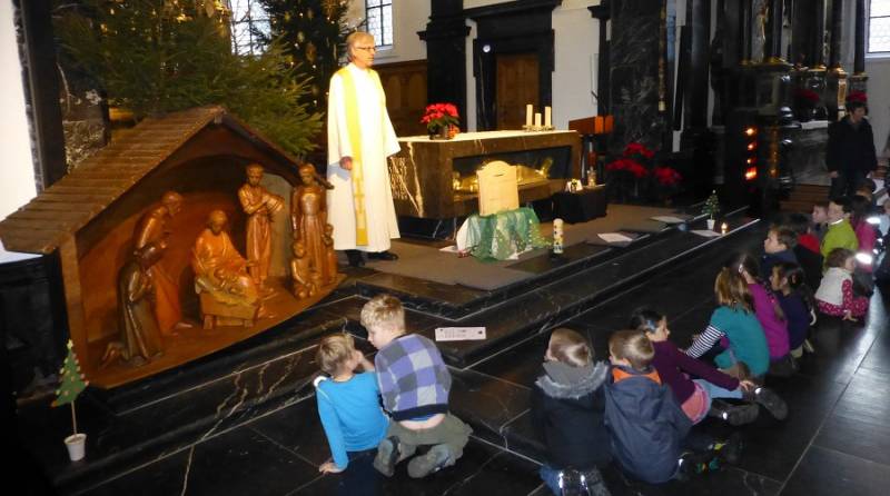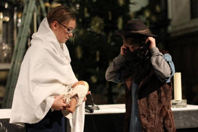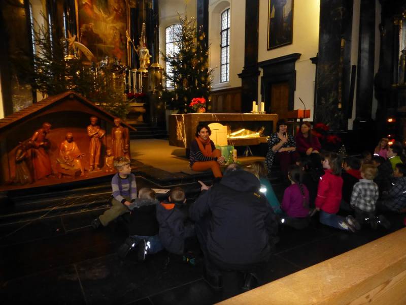 Kinder versammelten sich vorne im Chor und schmücken den Weg, den Maria und Josef nach Bethlehem angetreten haben.