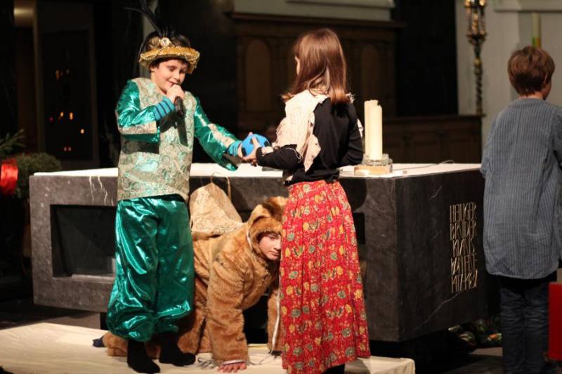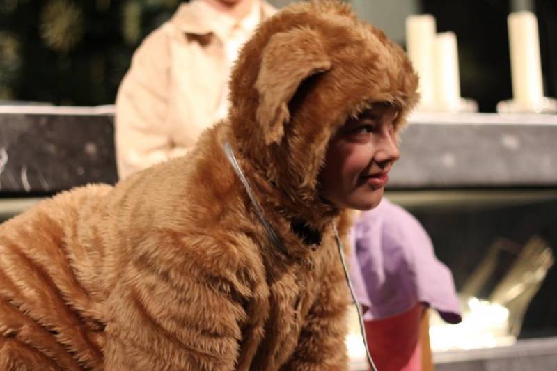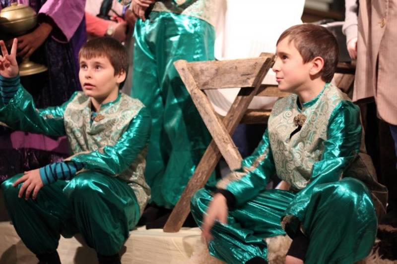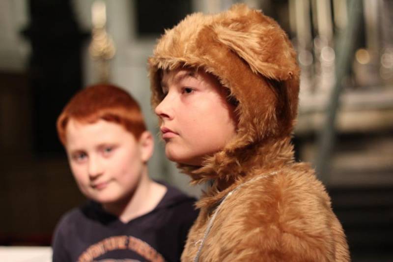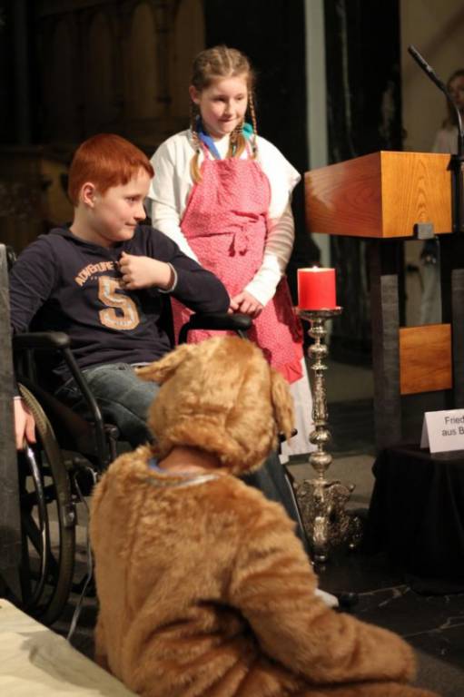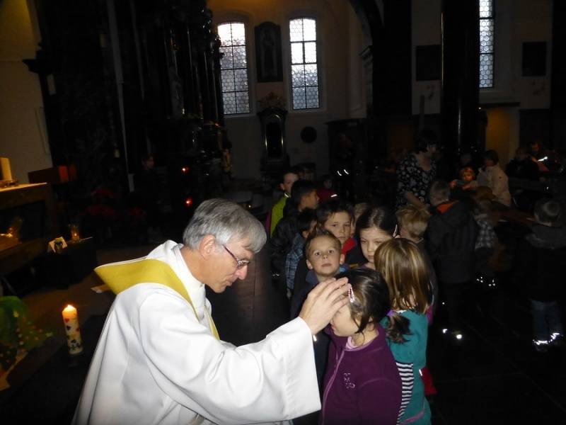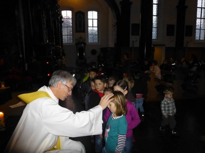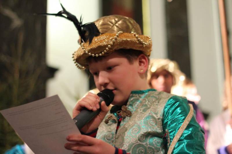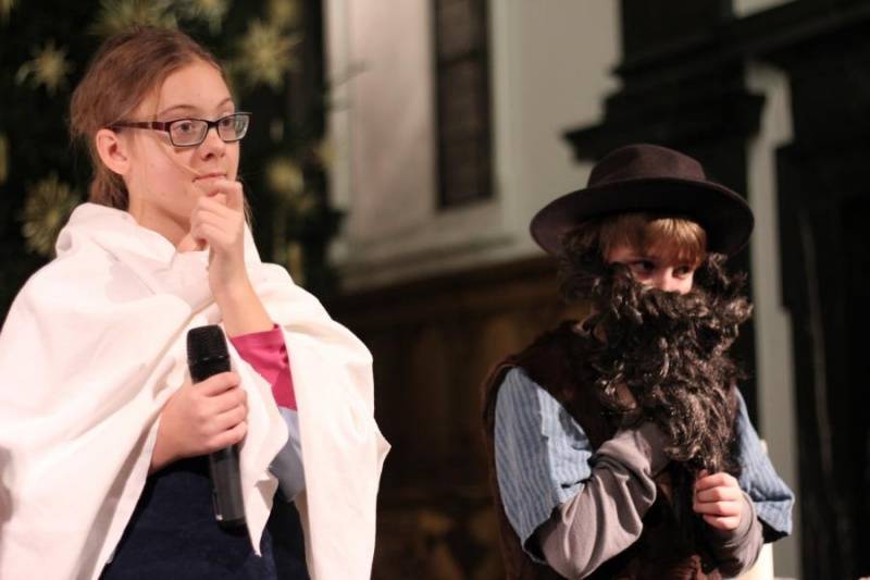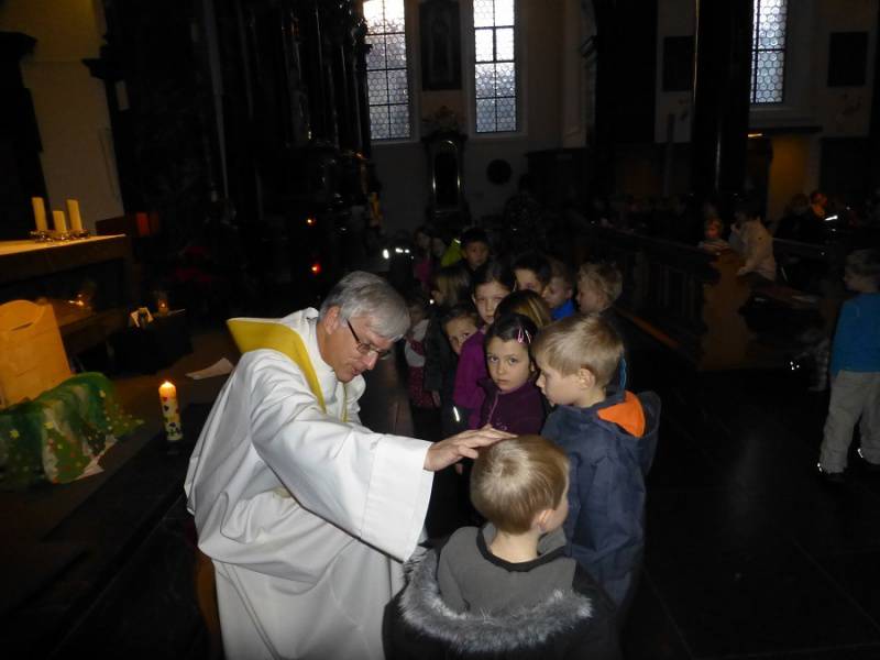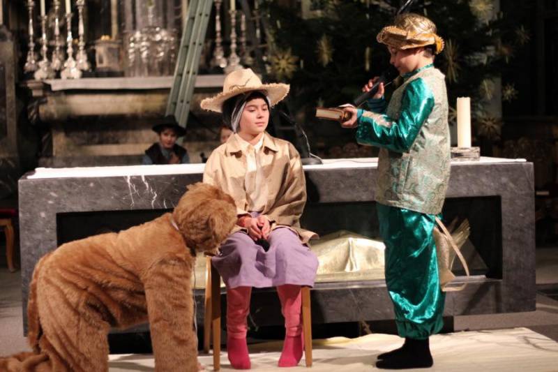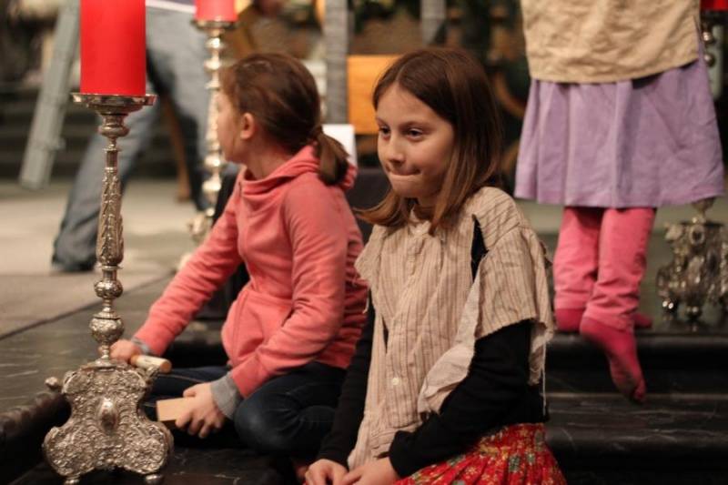 Kinder versammelten sich vorne im Chor und schmücken den Weg, den Maria und Josef nach Bethlehem angetreten haben.