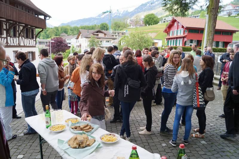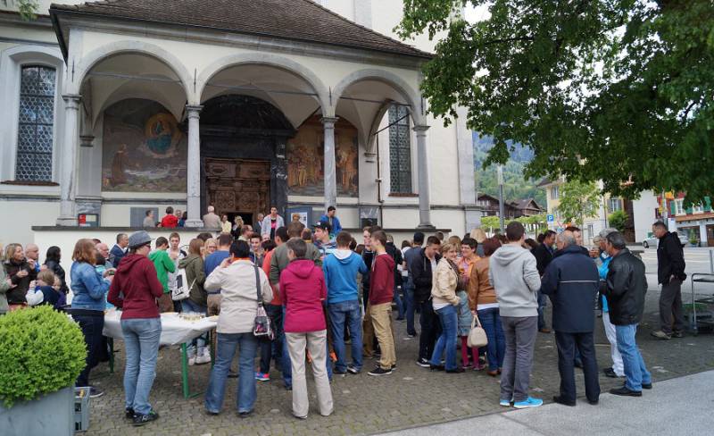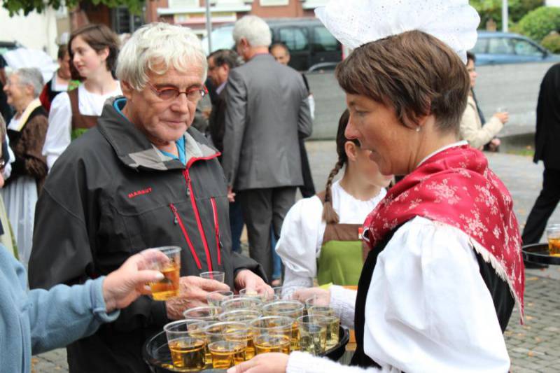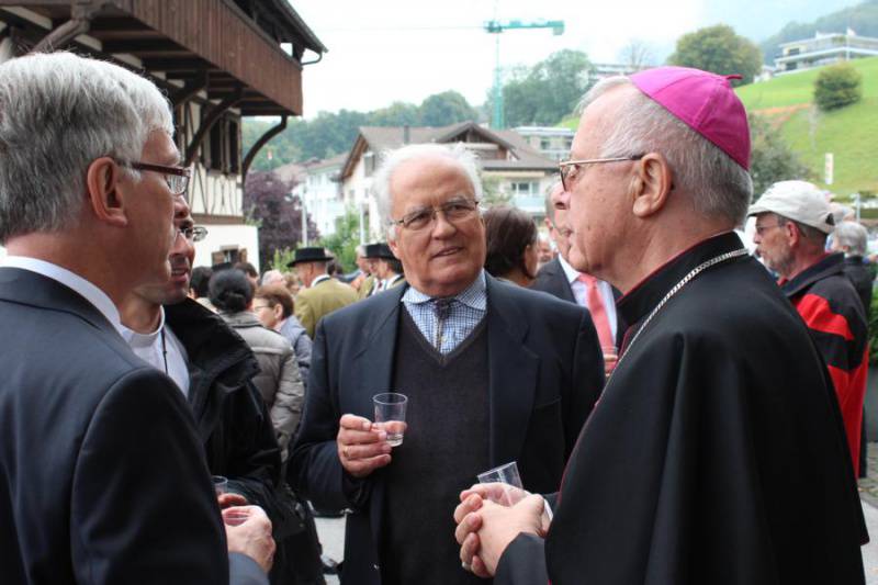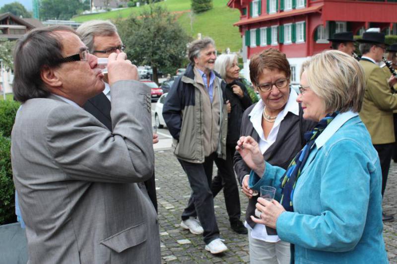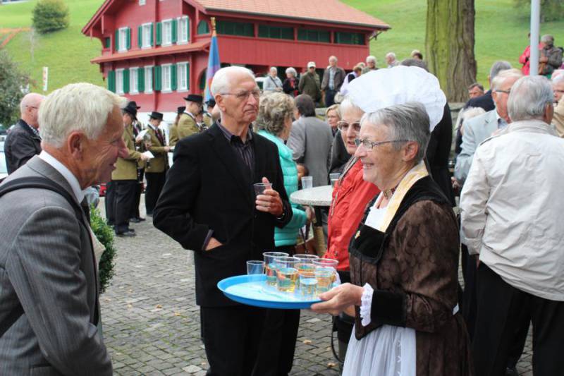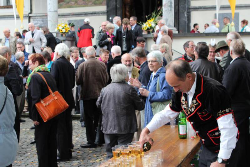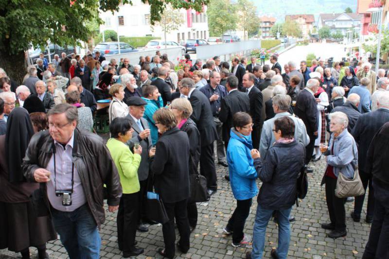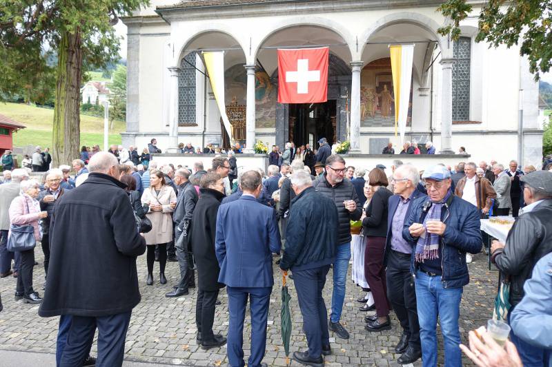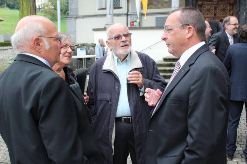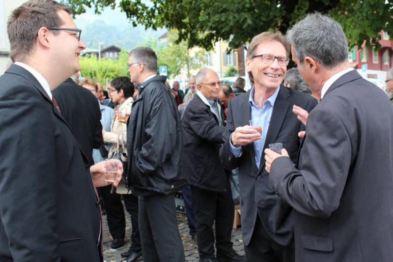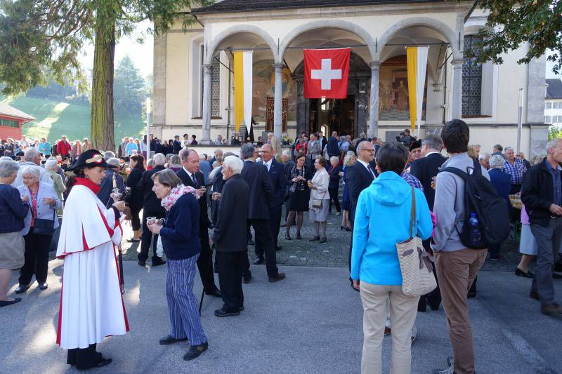 Nach dem Gottesdienst lud die Kirchgemeinde zum Apéro auf dem Kirchen-platz ein. Dieser Anlass bot Gelegenheit für das Gespräch und den Kontakt mit den vielen Gästen aus Kirche und Politik.
