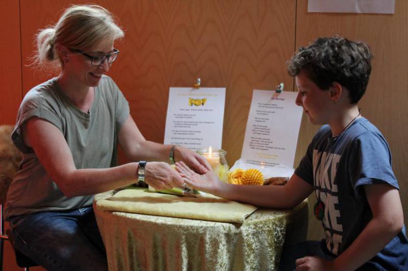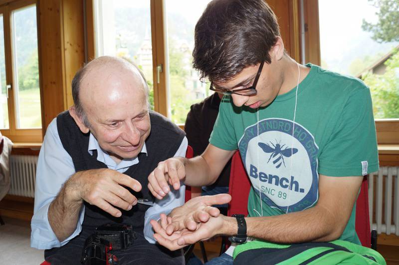 Am Montag begegneten die Jugendlichen taubblinden Menschen. Um mit ihnen kommunizieren zu können, lernten die Schülerinnen und Schüler das Lorm-Alphabet, das zur Kommunikation von Taubblinden mit anderen Menschen dient.