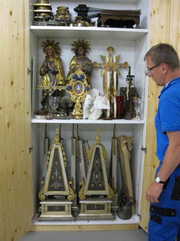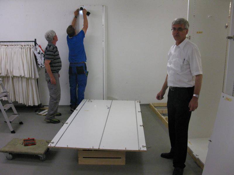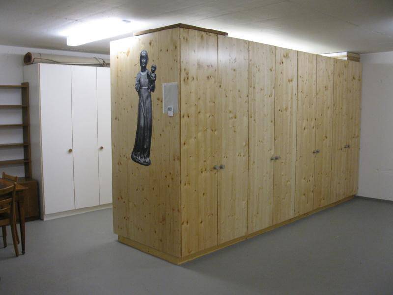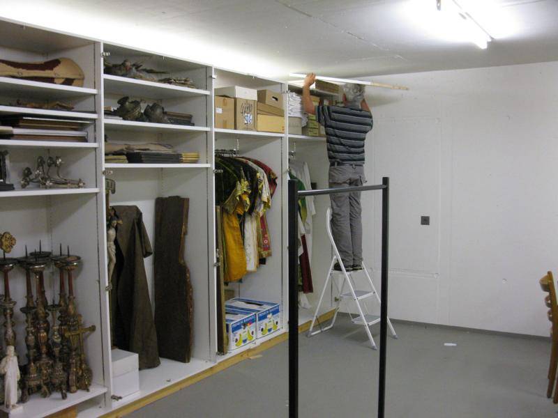 Im Archivraum des Pfarreiheims soll gemäss Beschluss der Kirchgemeinde-versammlung vom 21. Mai 2014 ein historisches Archiv entstehen. Dafür musste der Raum zuerst aufgeräumt und vorbereitet werden. Während der letzten Tage verwandelte sich der Keller des Pfarreiheims zu einer Baustelle. Schränke wurden ausgeräumt, zerlegt und verschoben. Und allerlei Ramsch, der sich in den letzten Jahren angesammelt hatte, wurde versorgt oder entsorgt. Nun präsentiert sich der Kulturgüterraum von seiner besten Seite. Er ist soweit vorbereitet, dass in den nächsten Wochen die Schieberegale eingebaut werden können. Dank guter Planung finden die Erstkommunionkleider und die Gewänder für St. Nikolaus und seine Begleiter weiterhin Platz im Archivraum.