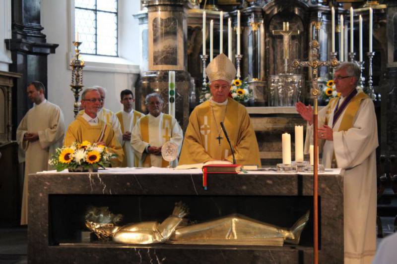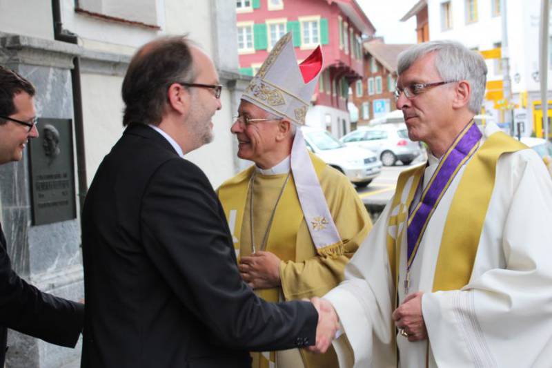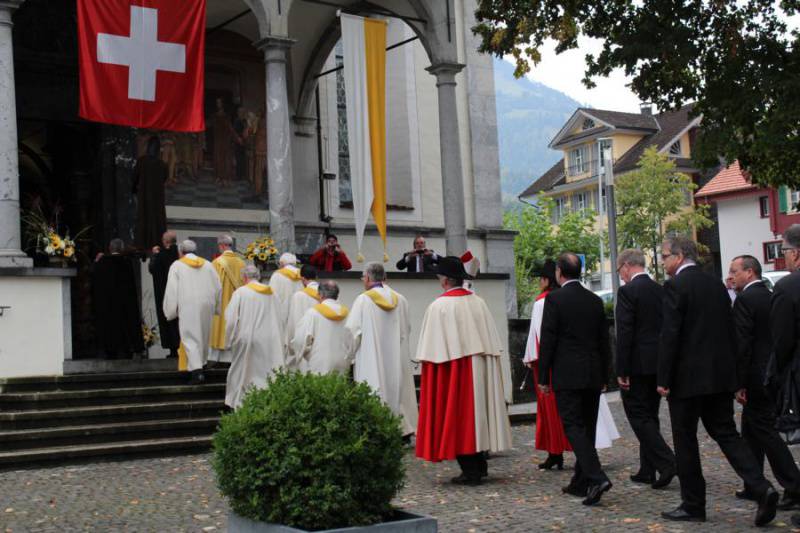 Diese Begriffe hat Bischof Dr. Paul Hinder zu Leitworten für das Bruder-Klausen-Fest 2015 gewählt. Gerechtigkeit und Friede waren vor bald 600 Jahren ganz grosse Anliegen des Schweizer Landesheiligen. Genauso versteht Bischof Hinder Gerechtigkeit, Friede und Freude als Grundlage und Ziel für seine oft schwierige Arbeit auf der Arabischen Halbinsel. Eine bis auf den letzten Platz gefüllte Sachsler Kirche lauschte den Predigtworten des Ehrengastes aus Abu Dhabi. Der Chor der Kantorei Sachseln - begleitet von Instrumentalisten - verschönerte mit der Orgelsolomesse von J. Haydn den Festgottesdienst.