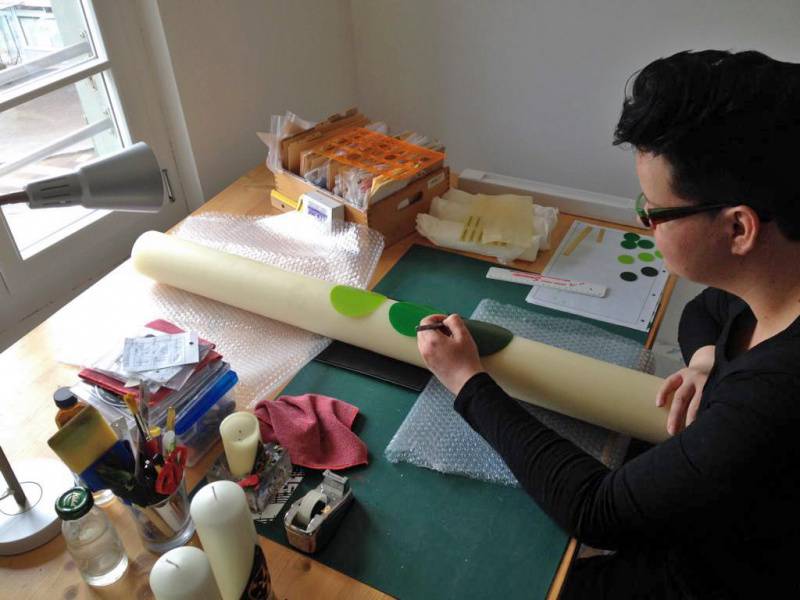 Hier entsteht in Handarbeit die Osterkerze 2014 für die Pfarrei Sachseln. Angelina Hess entwirft diese und verziert im Auftrag der Pfarrei 350 Exemplare von Hand .