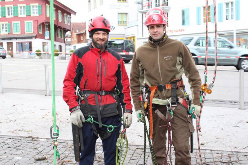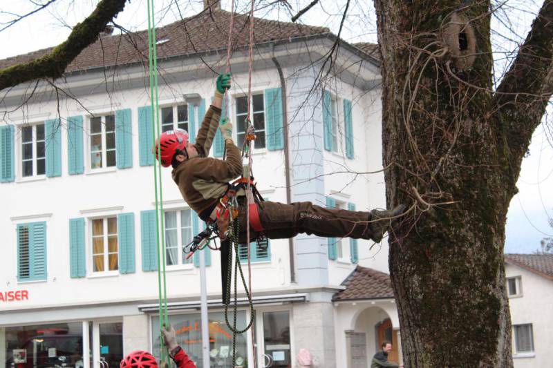Wenn Männer auf 20 Metern Höhe in den obersten Ästen einer Linde umherturnen, denkt man ohne böse Absicht an Affenbäume. So geschehen am 18. Februar auf dem Kirchenplatz in Sachseln. Die wohl gegen 100 Jahre alte Linde auf dem Dorfplatz hatte einen Entlastungsschnitt nötig. Diesen auszuführen beauftragte der Kirchgemein-derat die Firma Riebli Forst AG. Zwei Männer an Seilen kletterten bis auf die äussersten Äste, um dürres Holz und störende Zweige abzuschneiden. Solche Arbeiten sind nicht ganz ungefährlich. Aber die Männer, die auch in der Freizeit klettern, waren die ganze Zeit über gesichert.