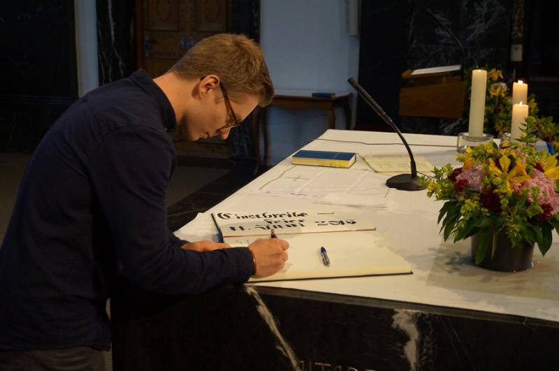Ehrengästen aus Kirche und Staat ziehen in die reich geschmückte Kirche ein.