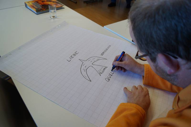 Die Wanderung begann in der Kapelle Ewil. Dort wurde zum Einstieg der Kurzfilm „one minute fly“ gezeigt. Eine Fliege hat eine Minute zu leben und erstellt eine Checkliste darüber, was sie in dieser Zeit alles erledigen will: sich verlieben, jemandem vor einem Vogel retten, ein Abenteuer überstehen, jemandem helfen, berühmt werden,…