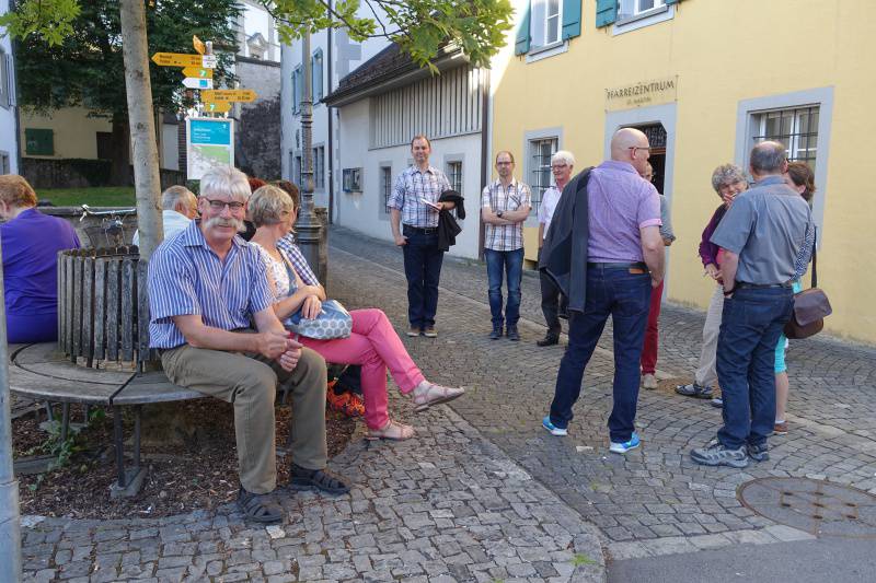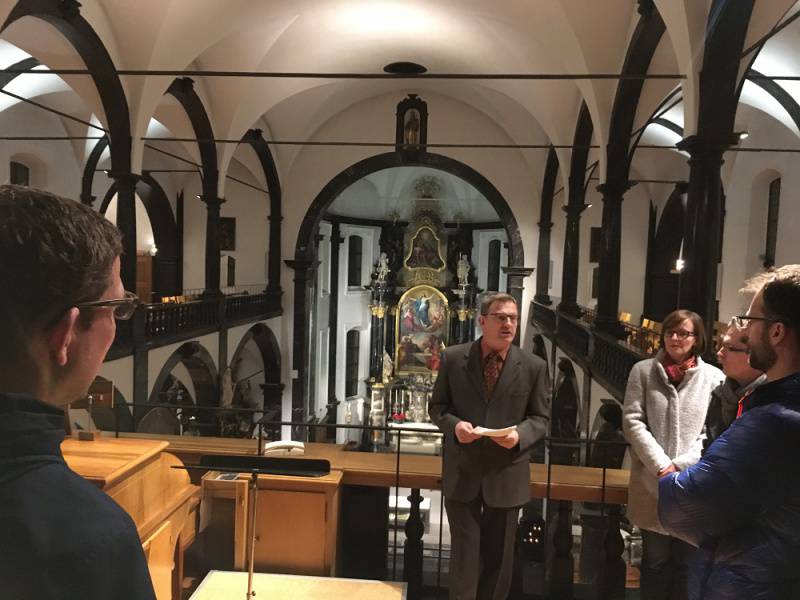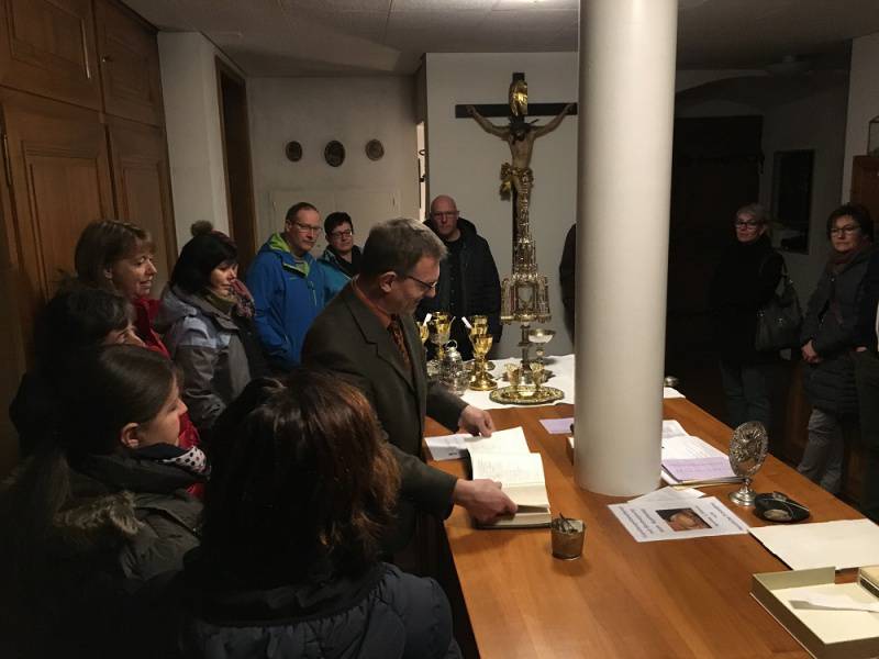 Zahlreich sind sie der Einladung gefolgt. Zuerst führte unser Sakristan Kurt Rohrer durch die Pfarrkirche. Spannendes und Humorvolles wusste er aus der über 300 jährigen Geschichte unserer Pfarrkirche zu erzählen. Dazu gehörte auch ein sehr interessanter Einblick in den Kirchenschatz, der jahrhundertalte und sehr wertvolle Gegenstände wie Kelche, Kreuze oder Monstranten enthält.