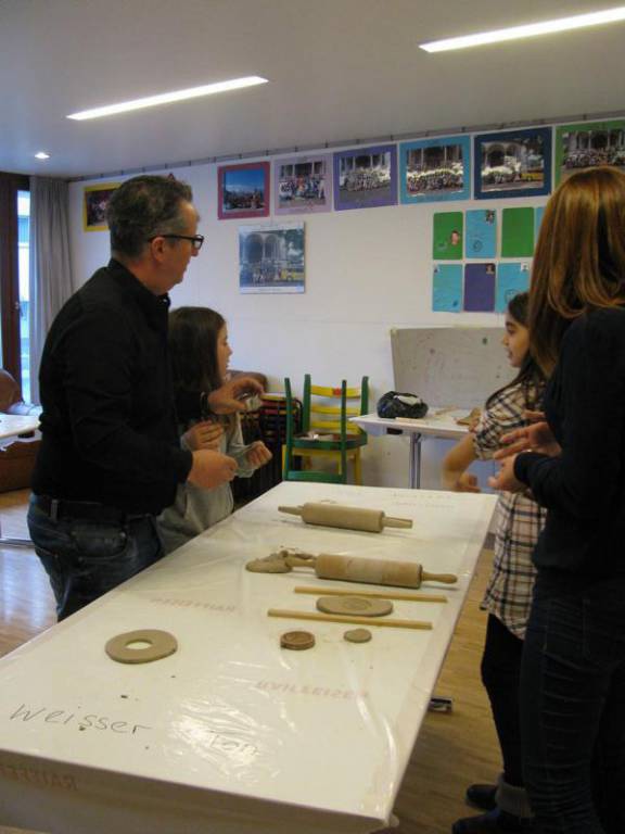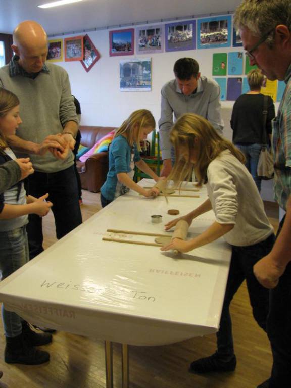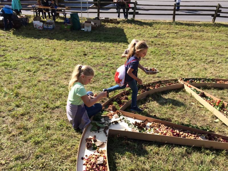 Die Bilder zeigen Kinder am Familientag bei der Arbeit am grossen Radbild auf der Schiblochmatte im Flüeli.