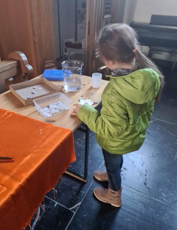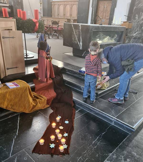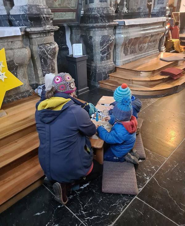 An fünf Stationen begegneten die Familien wichtigen «Gestalten», die selber auch zur Krippe gingen oder den Weg dorthin zeigten. Es gab jeweils etwas zu sehen, zu hören oder auf sich wirken zu lassen. Gestalterisch durfte vertieft werden, um zum Leben eine Verbindung zu finden.