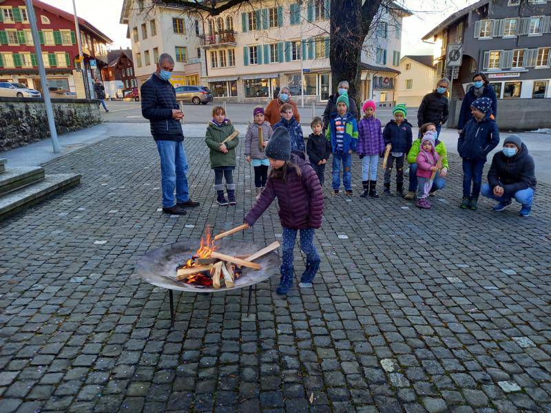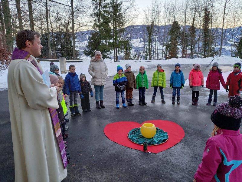 Ein kalter Wintermorgen hat die Kinder vom Flüeli mit ihren Lehrpersonen eingeladen, einen besonderen Morgen in der Adventszeit zu feiern. Nicht im warmen Schulhaus wie gewohnt, hat der Kindergartenmorgen oder der Schulmorgen mit der Lichtfeier angefangen, nein ... in der Kälte unter dem grossen Himmelszelt durften wir alle spüren, dass der liebe Gott da ist und jedem von uns ins Ohr flüstert: Freue dich, bald, bald ist Weihnachten.