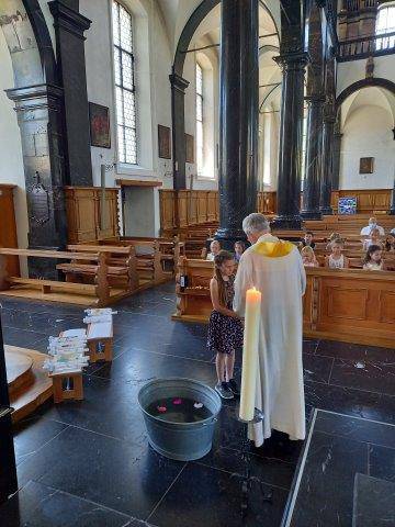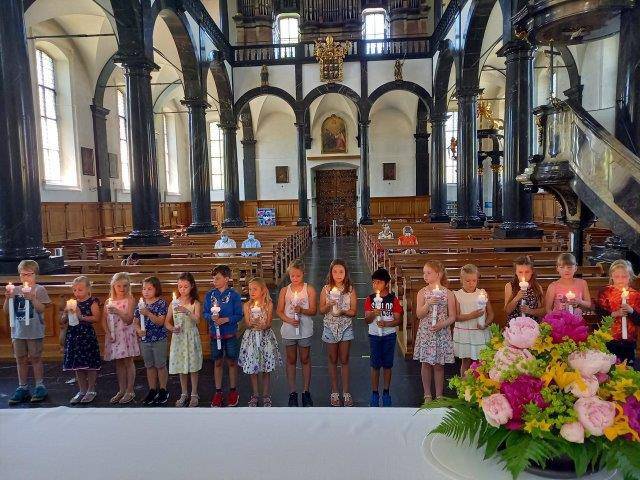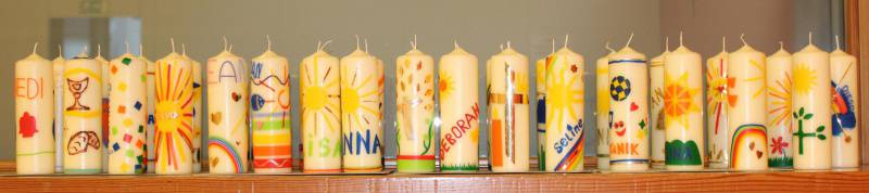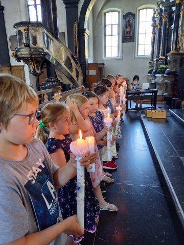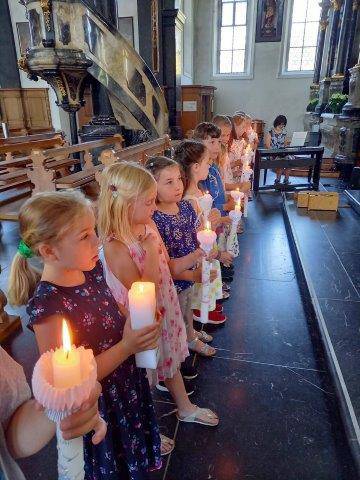 Als wichtiger Höhepunkt auf dem Weg zur Erstkommunion durften die Kinder am Ende vom Unterrichtsjahr in ihrem Klassenverband, die Tauferinnerungsfeier mit der Erneuerung vom Taufversprechen feiern. Voll Ehrfurcht haben die Kinder ihre Taufkerze in der Hand gehalten und das Licht Gottes, so in ihrem Herzen, neu leuchten lassen. Das Lichterband, das von der Osterkerze zu jedem Kind mit seiner Taufkerze entstanden ist, erzählt: Als getauftes Kind bist du ein Kind des Lichts – freue dich darüber!