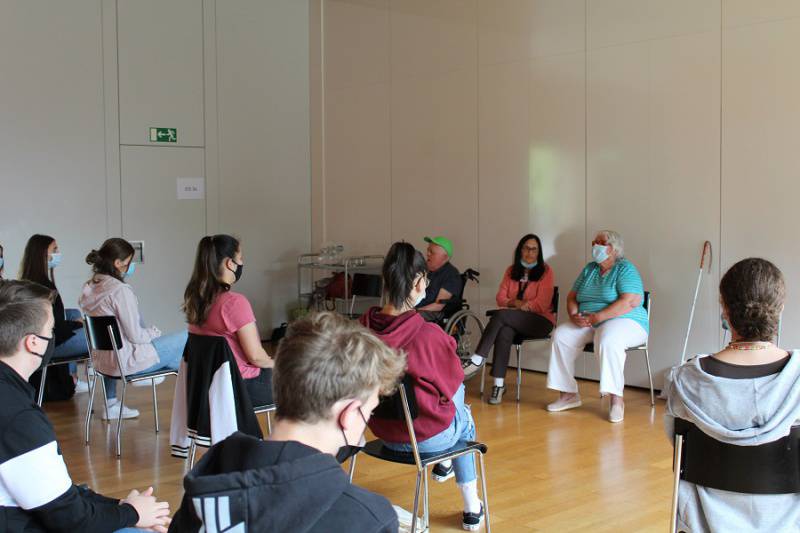 Die taubblinden Menschen erzählten den Schülerinnen und Schülern aus dem eigenen Leben. Aufmerksam hörten die Jugendlichen zu, wie Gehörlose ihre Schul- und Jugendzeit erlebt haben oder wie Sehbehinderte ihren Alltag meistern.