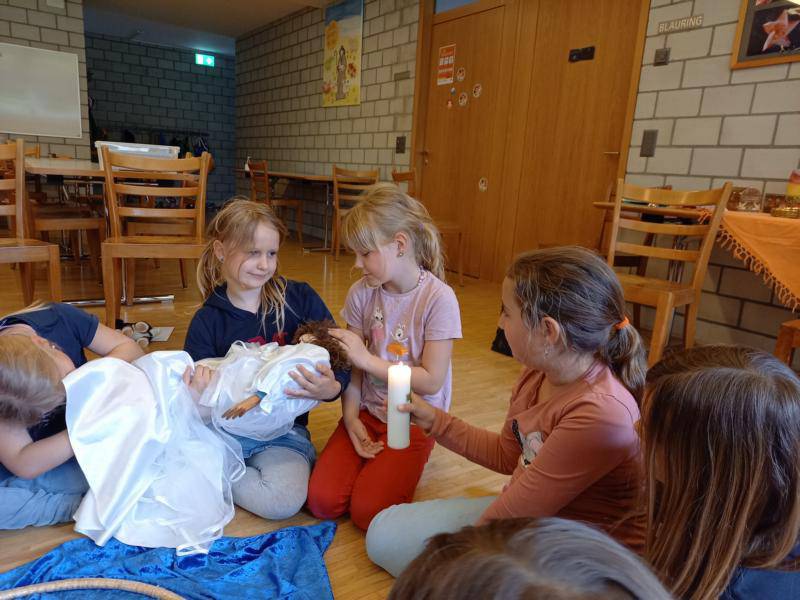 Im Religionsunterricht haben sich die Kinder der 2. Klassen mit dem Sakrament der Taufe auseinandergesetzt. Dabei haben sie wichtige Zeichen der Taufe kennen gelernt und mit einer Puppe das Taufritual spielerisch ganz nahe erlebt.