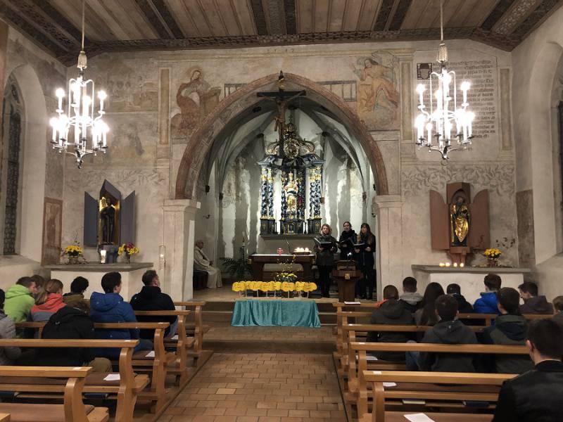 Der Himmel über Flüeli war sternenklar und sternenvoll. Eine schönere Abendstimmung hätten sich die Jugendlichen aus der 3. IOS auf ihrem Weg in den Ranft nicht wünschen können. Dort, in der unteren Ranfkapelle, feierten sie am 11. November eine Friedensmesse. Bei der Vorbereitung fragten sich die Jugendlichen: Wo braucht es eigentlich Frieden? Sie mussten nicht weit weg suchen. Sie wurden ganz in der Nähe fündig: «I dr Schuel, wenn Kollegä und Kolleginä kä Rueh meh gfindid, will sie von dä anderä uisgschlossä und gmobbt wärdid.». Auch an die Mitmenschen weit weg dachten sie: «Z Syrien, wo sit 10 Jahr ä Birgerchriäg herrscht. Viel Chind und Erwachsnigi sind i däm Chriäg gstorbä oder sind immer nu uf dr Flucht.»