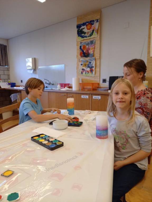 Alle 42 Erstkommunionkinder von Sachseln und Flüeli waren an einem ausserschulischen Anlass, Mi 16. Nov. eingeladen, eine eigene Erstkommunion-Weg-Kerze zu gestalten. Jedes Kind durfte mit einer Begleitperson, sei das Mami, Papi, Gotti oder Götti bei frohem Tun, bereits etwas von unserer grossen Fest-Gemeinschaft der Erstkommunion erleben. Während dem die Kinder unter der Anleitung von einigen Eltern, eine weisse Kerze in ein farbenfrohes Kunstwerk verwandelten, durften sie in ihren Herzen einen Funken Vorfreude auf ihre Erstkommunion spüren. Wie schön, wenn nun viele Lichter gerade jetzt in der dunklen Jahreszeit im zu Hause der Kinder leuchten dürfen und von Jesus erzählen, der sie bald an seinen Tisch einlädt. Nachdem Pfarrer Daniel Durrer alle Kerzen gesegnet hat – wurden diese Weg-Kerzen für die Kinder ein kostbares Zeichen der Liebe Gottes.