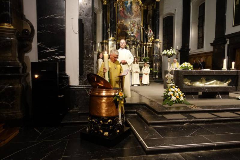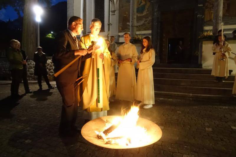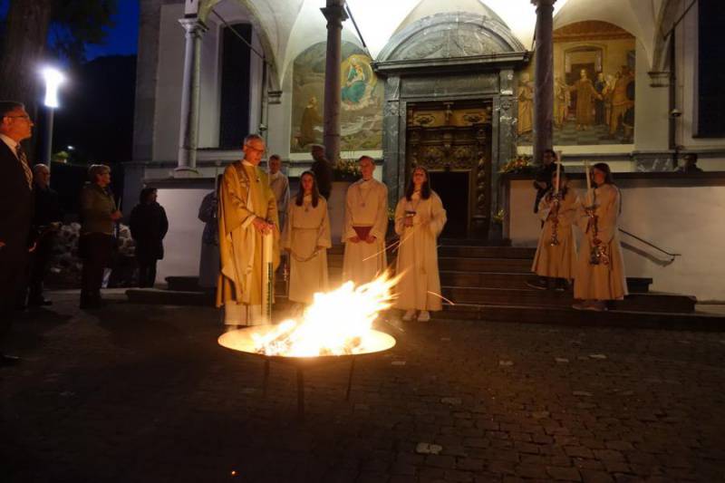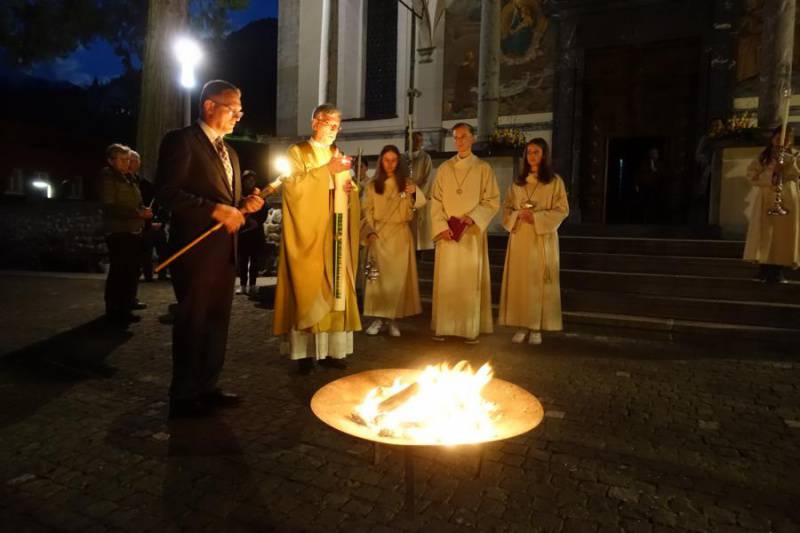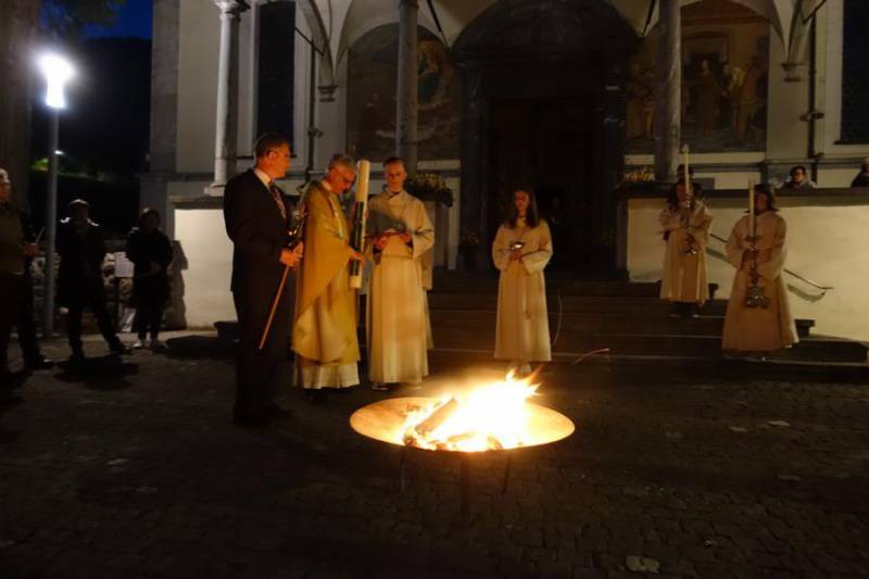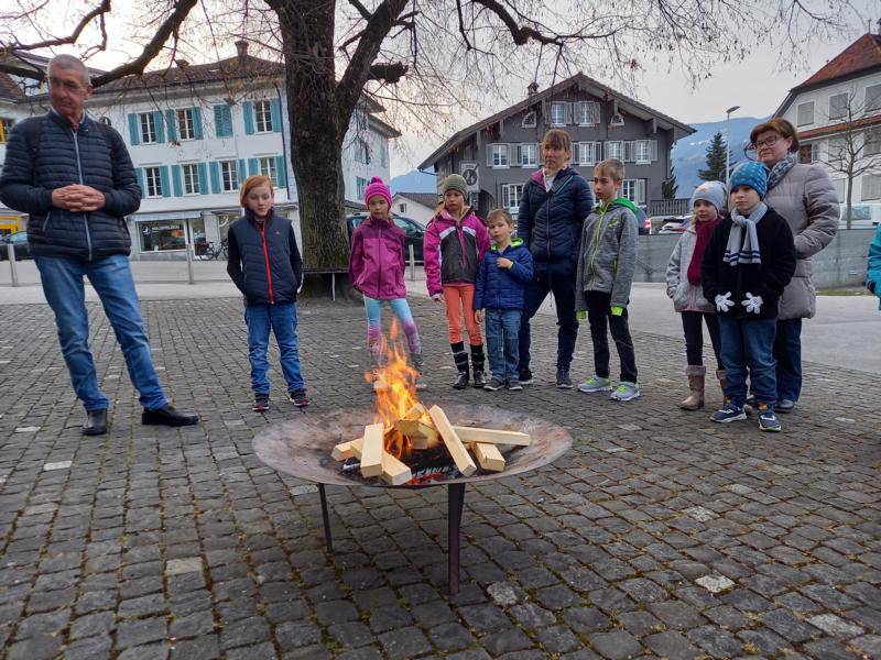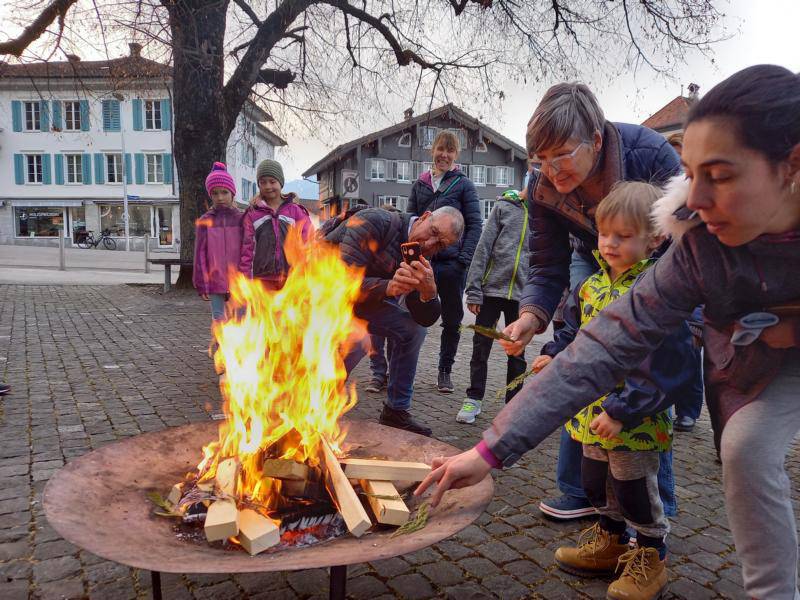 Beim Verbrennen von Holz und Palmzweiglein richteten wir unseren Blick auf die verborgene Kraft in der Asche und auf die Wärme des Feuers. So will uns die feine Asche in der Fastenzeit auffordern, mit wenig zufrieden zu sein und auf das Grosse im Kleinen zu achten. Die Wärme und das Licht des Feuers jedoch, erzählen uns jetzt schon etwas von grossen Osterfreude.