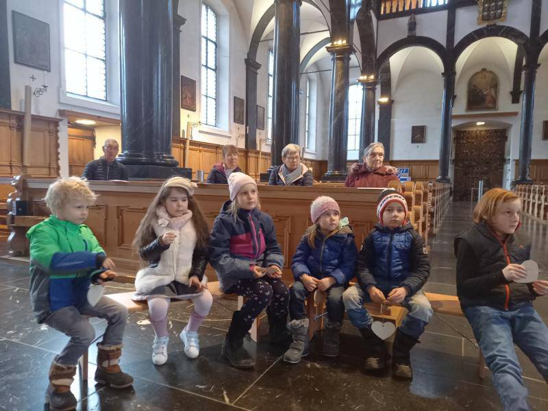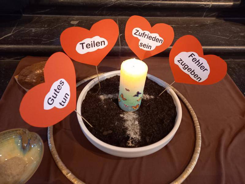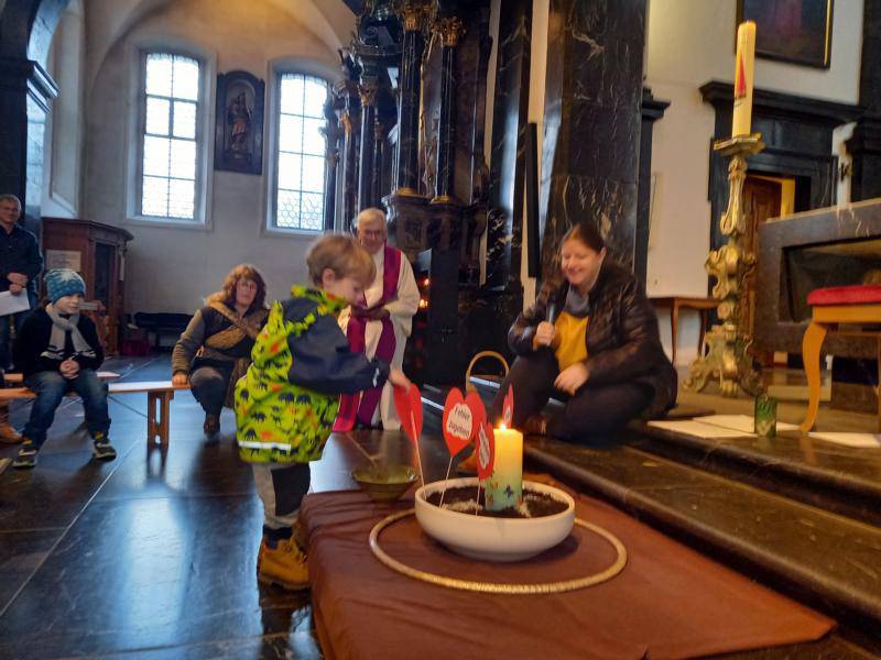 Nachdem die Kinder, die Asche feierlich in die Kirche getragen haben, durften wir von Jesus hören, der beim kleinen Zachäus eingekehrt ist und sein Herz geheilt hat.