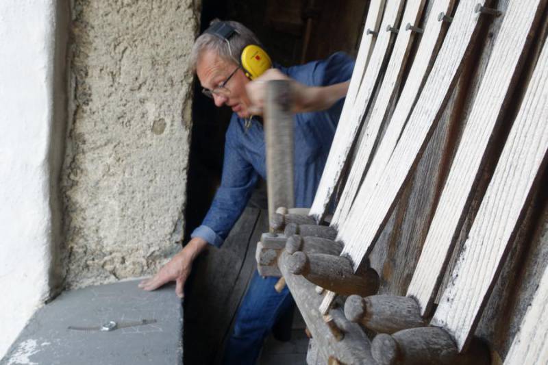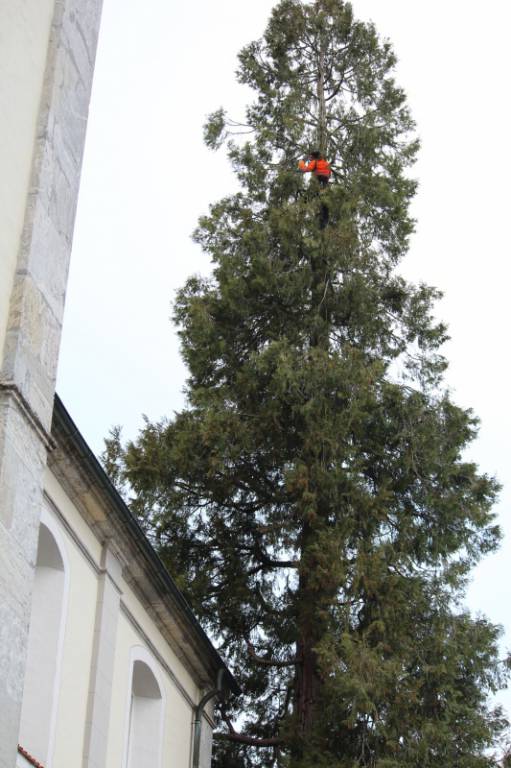 Der rund 140-jährige Baum - es handelt sich übrigens um eine Weihrauchzeder (auch kanadische Rauchzypresse genannt) - ist gemäss Aussagen von Fachleuten kerngesund. Eine Entfernung steht im Moment nicht zur Diskussion. Zur Erhöhung der Sicherheit hat der Kirchgemeinderat daher einen Baumpfleger beauftragt, der die trockenen Äste entfernt und überhängende Zweige schneidet. Auch soll vermieden werden, dass Marder über den Baum ins Dachgeschoss der Kirche eindringen, wo sie die (geschützte) Fledermauspopulation schädigen. Die Arbeit ist selbst für einen professionellen Baumpfleger nicht ungefährlich. Solche spektakulären Bilder boten sich am Montagmorgen.