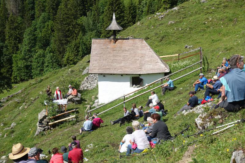 Diesmal lockte der Alpgottesdienst vom Pfingstmontag gegen 80 Wanderlustige auf das Chlisterli. Nebst schönem Wetter, guter Stimmung, Nahrung für die Seele und Alphornklänge gab es dort - spendiert von Daniel Durrer - einen Apéro zum 40. Primizjubiläum des Sachsler Pfarrers, der genau am 6. Juni vor 40 Jahren Heimatprimiz in Kerns gefeiert hatte.