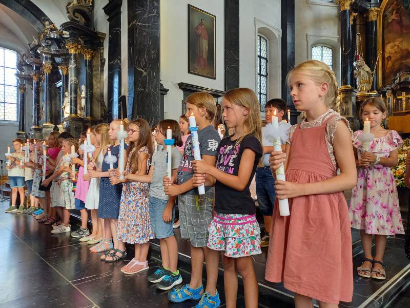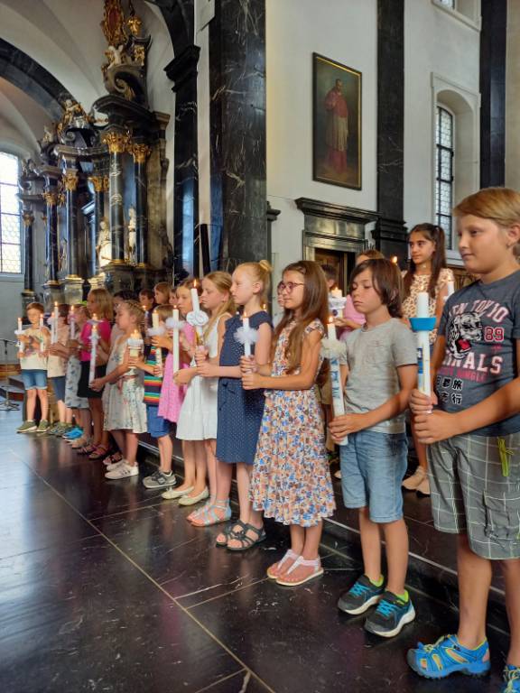 Mit dem Leitgedanken „Wasser schenkt Leben“ durften 31 Kinder aus unserer Pfarrei ihr Fest der Tauferinnerung feiern. Festlich gekleidet und in der Begleitung ihrer Angehörigen wurden sie beim Namen gerufen und durften ihre Taufkerze neu zum Leuchten bringen. Mit viel Freude haben die Kinder der 2. Klassen diesen Gottesdienst mitgestaltet und die Zeichen der Taufe sichtbar und erlebbar gemacht. Unter der Leitung von Ilona Wyrsch wurde der Kirchenraum von den Kindern mit Wasser-Klängen belebt und so wurde der Wert des Tauf-wassers mit allen Sinnen erlebbar.