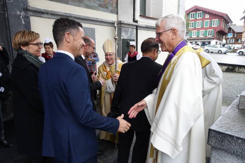 Bischof Joseph Maria Bonnemain als Ehrengast am Bruder-Klausen-Fest propagierte in seiner Predigt einen Glauben, der aufrichtet und nicht knechtet. Der Glaube an Jesus Christus sei eine frohe Botschaft, und diese bestehe nicht aus Paragraphen. "Folgen wir Christus nach." Aber noch wichtiger: "Gott folgt uns immer nach". Bonnemain fühlte sich bei seiner Predigt sichtbar wohl. Immer wieder weckte er bei den Gläubigen ein Schmunzeln oder gar ein herzhaftes Lachen. "Ich nutze jetzt meine Chance, wenn ich schon wieder einmal vor einer so vollen Kirche predigen darf." Und "bleiben wir vögeliwohl." Ohne Einschränkungen und mit einer spürbaren Erleichterung nutzten